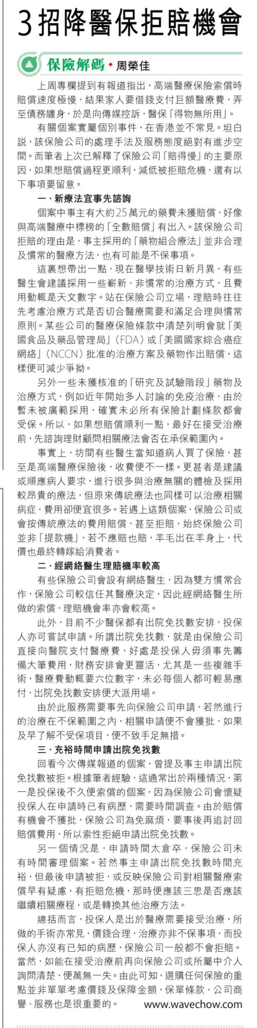 (原文刊登於2022年10月22日 信報<保險解碼>《3招降醫保拒賠機會》)