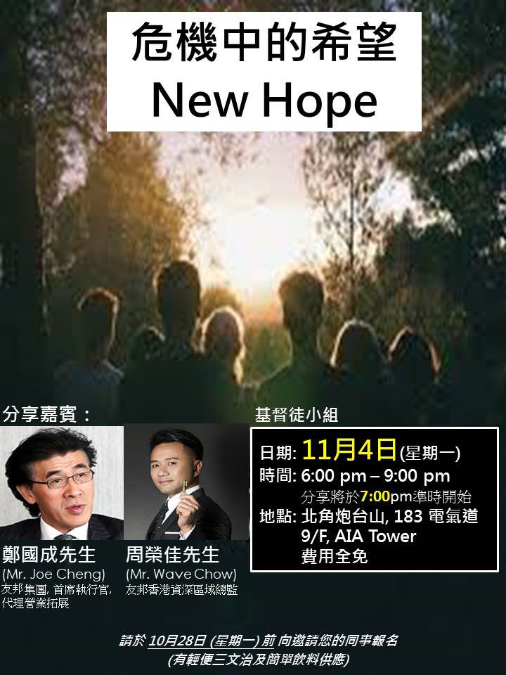 11月4日晚,友邦集團代理營業拓展首席執行官Mr. Joe Cheng和資深區域總監Mr. Wave Chow將會和大家一起分享“危機中的希望”。